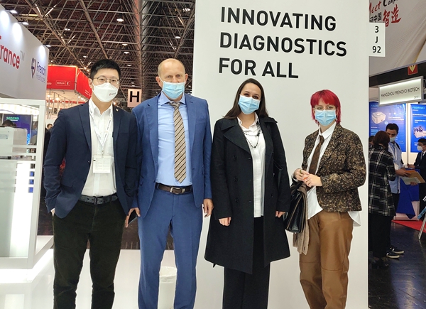 在经过同行推荐并使用了BB贝博艾弗森产品后,一位从事检测工作十多年的苏丹客户专门找到BB贝博艾弗森展台,进一步了解BB贝博艾弗森新冠和其他试剂检测业务。看完BB贝博艾弗森方案的操作后,他频频点头并表示,“你们的方案应用场景广、操作简便、精准可及,我非常看好你们!”